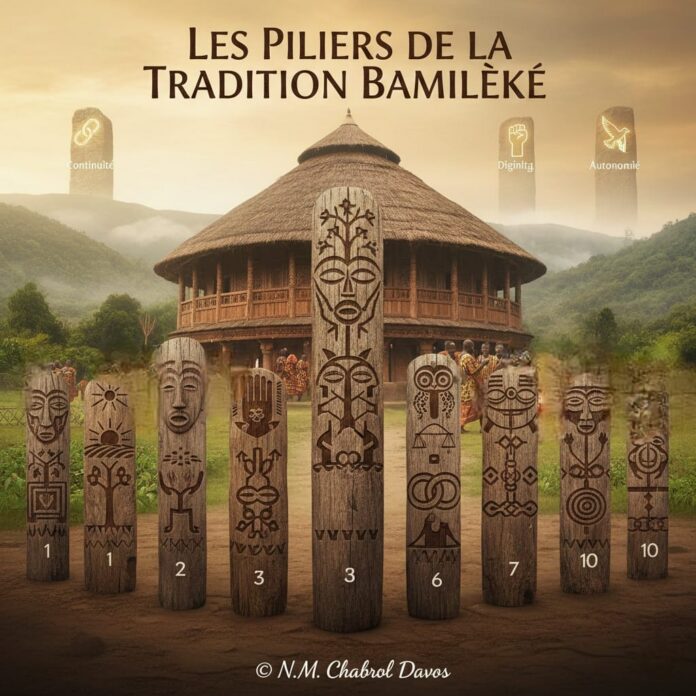 Ces principes n’ont pas toujours été nommés, car ils se transmettaient par l’exemple, les rites, la parole des anciens et l’organisation même de la vie quotidienne. Pourtant, ils ont guidé les formes de solidarité, la gestion des conflits, le rapport au travail, à la terre, à la famille et à l’autorité. Ils expliquent aussi pourquoi un peuple peut endurer longtemps la précarité, mais refuse durablement l’humiliation, la négation de sa dignité ou la rupture de sa continuité historique. Les formuler aujourd’hui ne vise ni à figer une tradition vivante, ni à sacraliser le passé. Il s’agit plutôt de rendre visibles les lignes de force qui ont permis à la société de se maintenir, de se réorganiser et de résister, même lorsque les cadres politiques imposés se sont révélés défaillants. Nommer ces principes, c’est ouvrir la possibilité de les comprendre, de les discuter et, le cas échéant, de les adapter sans en trahir l’esprit. C’est à partir de cette logique que peuvent être énoncés dix principes fondamentaux, non comme des dogmes immuables, mais comme les piliers sur lesquels se construit la cohérence spirituelle, sociale et politique du peuple bamiléké.